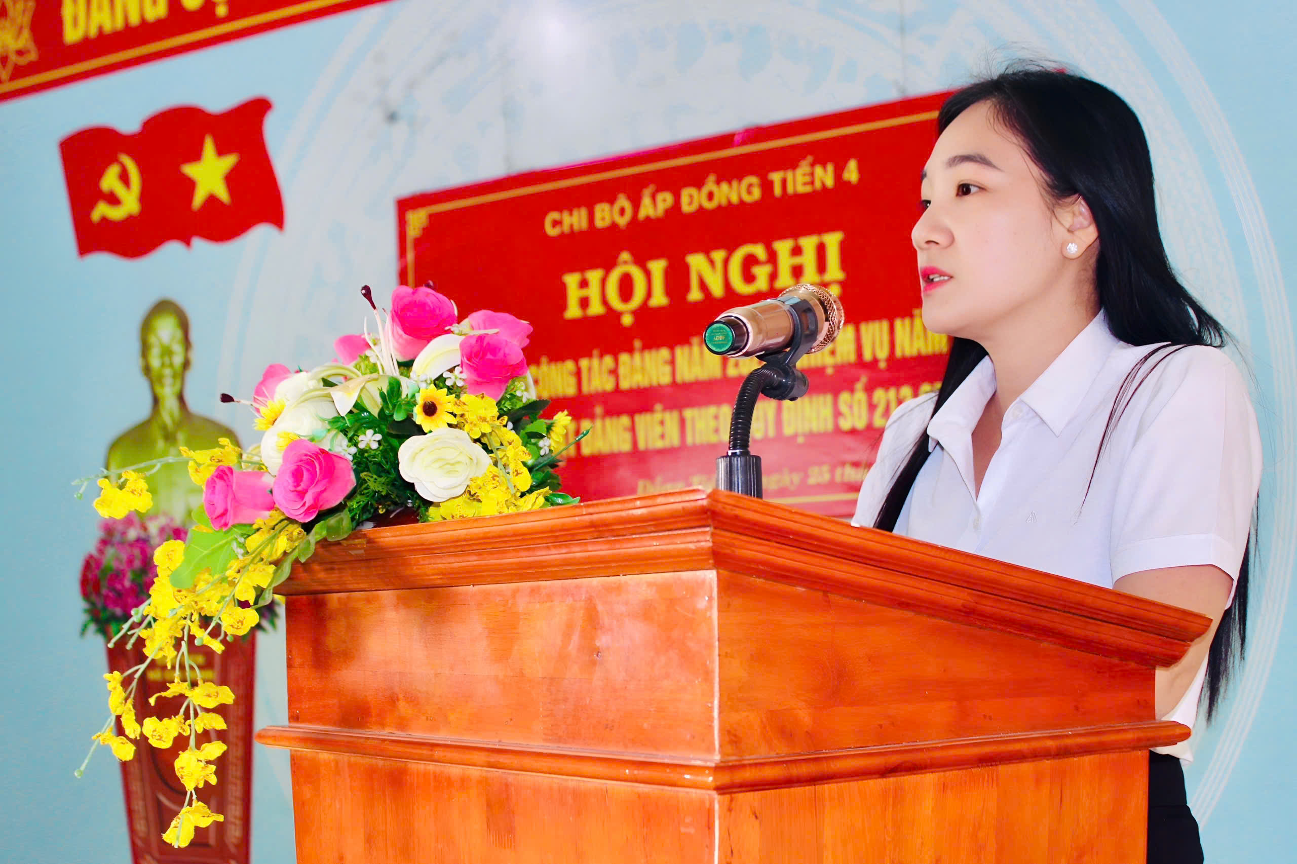 Phát biểu chỉ đạo tại hội nghị, lãnh đạo xã ghi nhận và đánh giá cao những kết quả Chi bộ ấp Đồng Tiến 4 đạt được trong năm 2025, đồng thời đề nghị chi bộ tiếp tục phát huy vai trò hạt nhân lãnh đạo ở cơ sở; chú trọng công tác xây dựng Đảng; nâng cao chất lượng sinh hoạt chi bộ; tăng cường giáo dục chính trị tư tưởng, phát huy tinh thần nêu gương của cán bộ, đảng viên; tiếp tục lãnh đạo thực hiện tốt các nhiệm vụ về an ninh trật tự, vệ sinh môi trường, xây dựng đời sống văn hóa, góp phần xây dựng khu dân cư ngày càng văn minh, phát triển./.