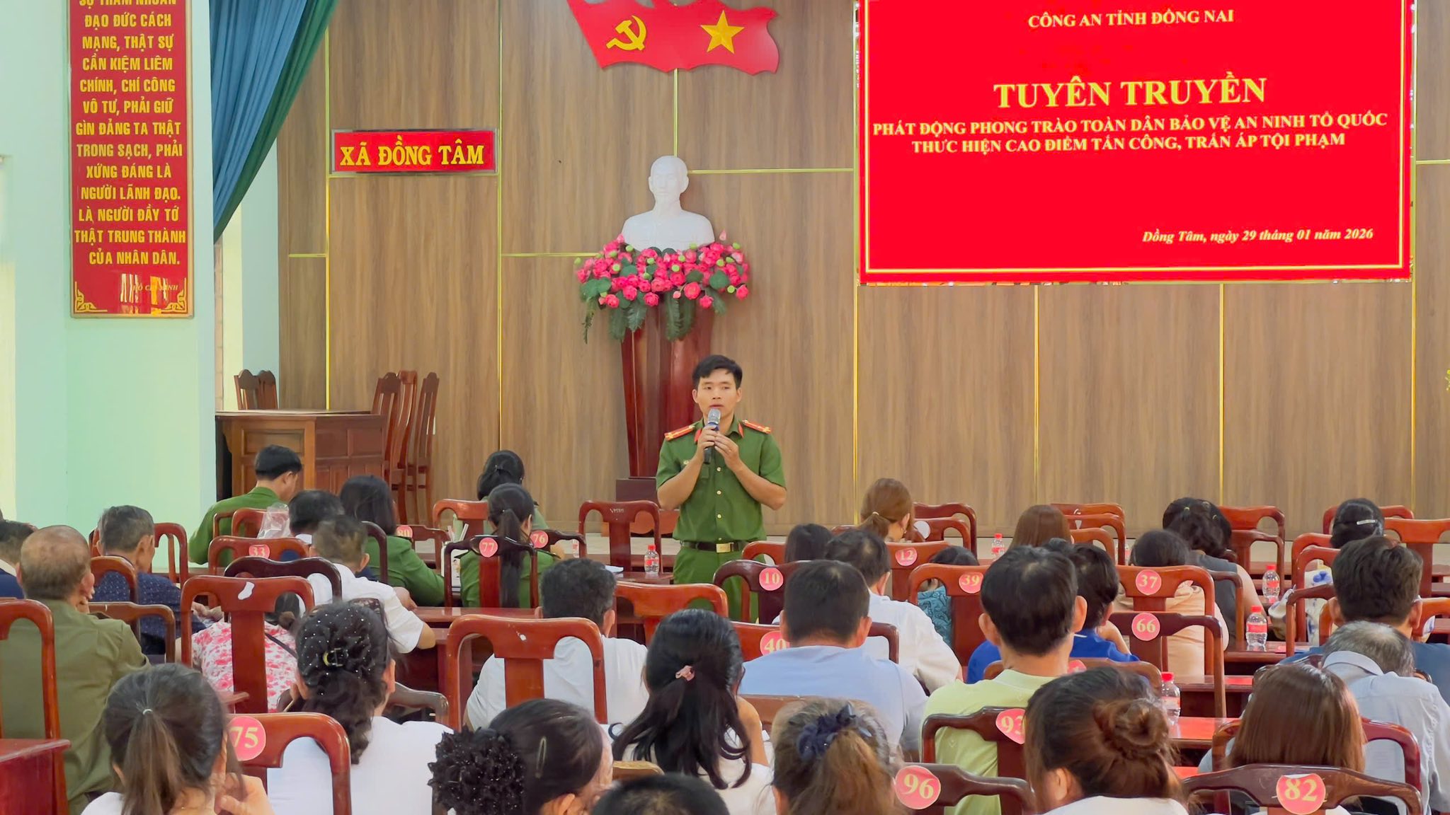 (ĐỒNG TÂM) – Chiều ngày 29/01/2026, tại Hội trường UBND xã Đồng Tâm, Công an tỉnh Đồng Nai phối hợp với UBND xã tổ chức buổi tuyên truyền, phát động phong trào “Toàn dân bảo vệ an ninh Tổ quốc”, gắn với thực hiện cao điểm tấn công, trấn áp tội phạm trên địa bàn.
