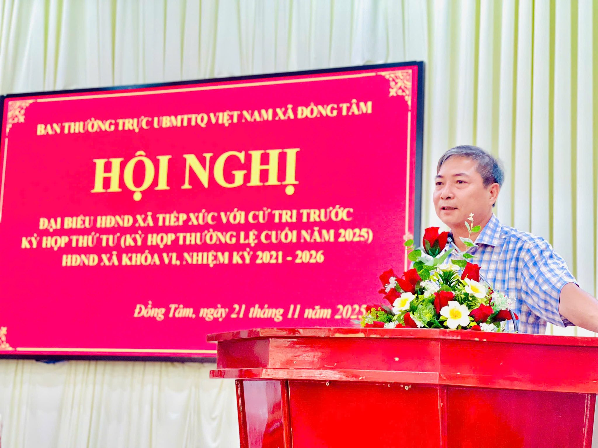 (ĐỒNG TÂM) - Ngày 21/11/2025, Ban Thường trực Ủy ban MTTQ Việt Nam xã Đồng Tâm tổ chức Hội nghị tiếp xúc cử tri với Tổ đại biểu HĐND xã trước Kỳ họp thứ Tư (kỳ họp thường lệ cuối năm 2025) của HĐND xã khóa VI, nhiệm kỳ 2021–2026. Hội nghị được tổ chức tại Hội trường Đảng ủy xã vào buổi sáng và Hội trường UBND xã vào buổi chiều.