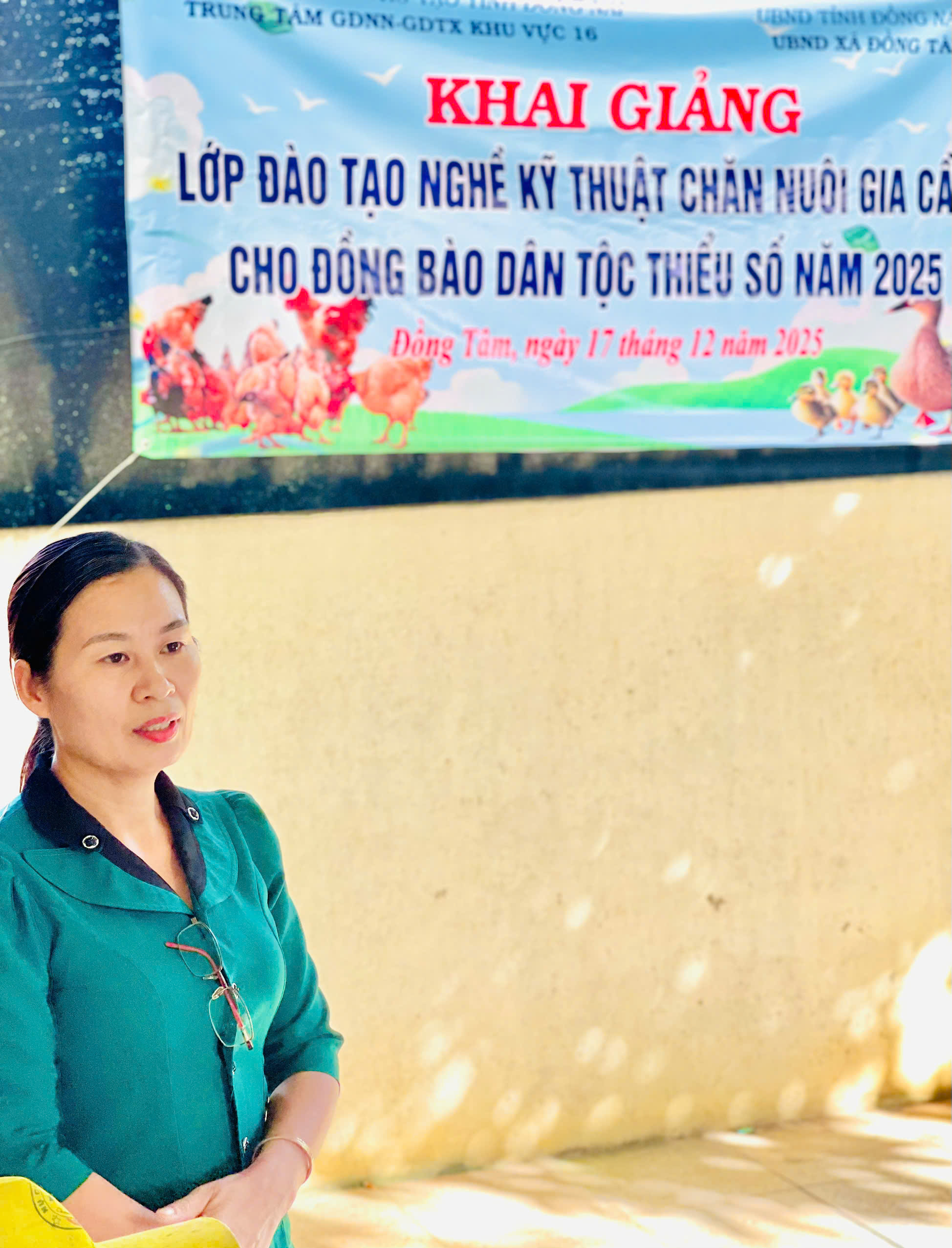(ĐỒNG TÂM) - Chiều ngày 17/12/2025, tại hộ gia đình bà Hà Thị Nhung, ấp Đồng Tâm 1, UBND xã Đồng Tâm phối hợp với Trung tâm Giáo dục nghề nghiệp – Giáo dục thường xuyên Khu vực 16 tổ chức Lễ khai giảng lớp nghề Kỹ thuật chăn nuôi gia cầm (CN04/2025) cho 35 học viên là người đồng bào dân tộc thiểu số trên địa bàn xã.