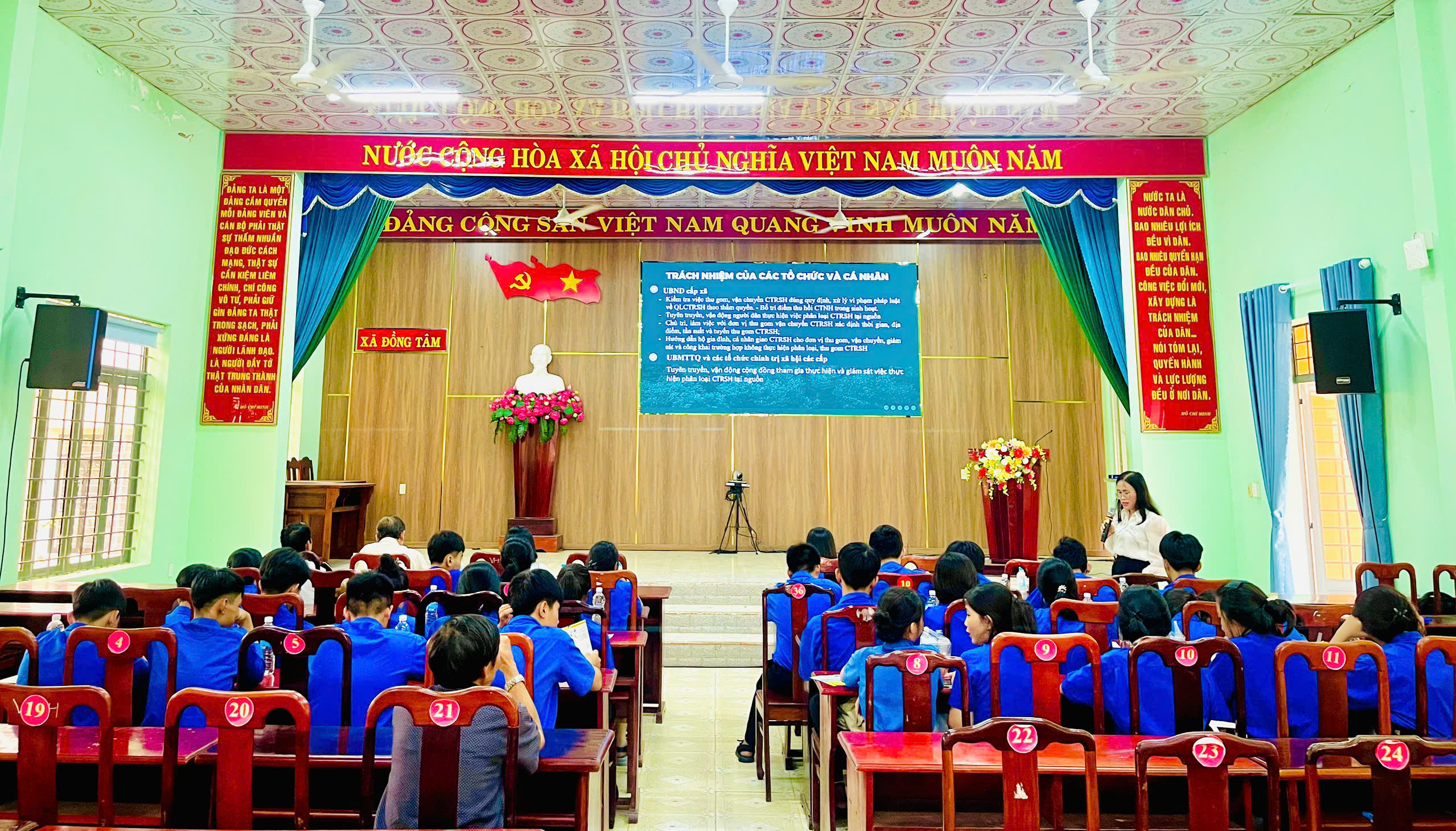 (ĐỒNG TÂM) - Ngày 14/12/2025, tại hội trường UBND xã Đồng Tâm, Phòng Kinh tế xã phối hợp với Đoàn Thanh niên xã, Trung tâm Dịch vụ Tổng hợp xã và Hội Liên hiệp Phụ nữ xã tổ chức chương trình tuyên truyền “Phân loại rác thải sinh hoạt tại nguồn trên địa bàn xã Đồng Tâm” năm 2025.