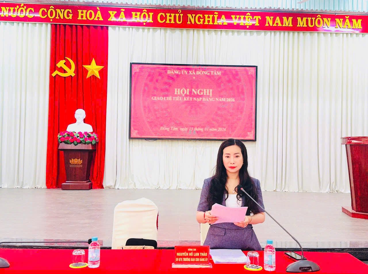 (ĐỒNG TÂM) – Sáng ngày 15/01/2026, tại Hội trường Đảng ủy xã Đồng Tâm, Đảng ủy xã tổ chức Hội nghị giao chỉ tiêu kết nạp đảng viên năm 2026 cho các chi bộ, đảng bộ trực thuộc. Hội nghị do đồng chí Nguyễn Hồ Lan Thảo, Ủy viên Ban Thường vụ Đảng ủy, Trưởng Ban Xây dựng Đảng chủ trì.