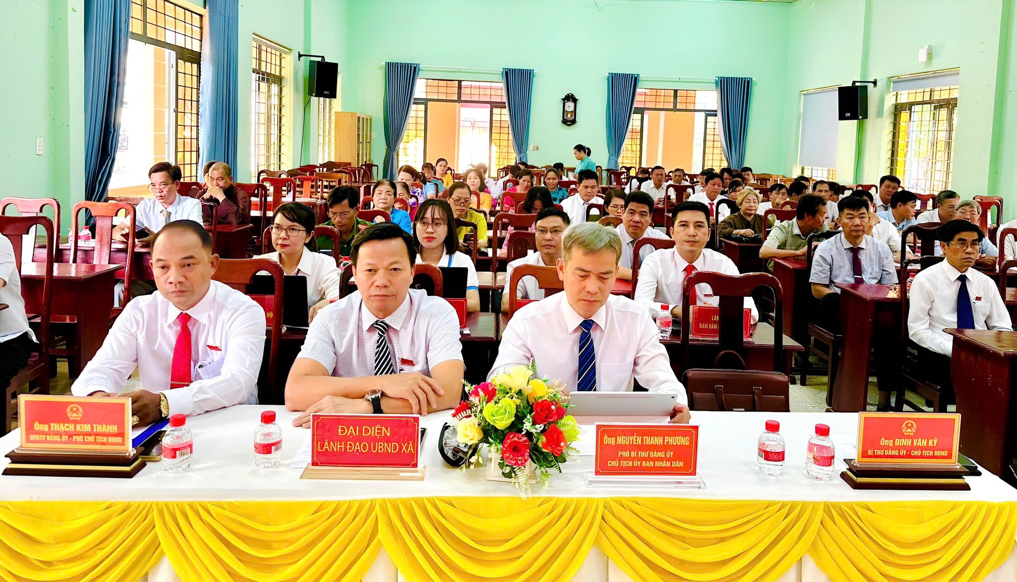 Tham dự hội nghị có các đồng chí: Đinh Văn Kỹ – Bí thư Đảng ủy, Chủ tịch HĐND xã; Phùng Thị Cẩm Tú – Phó Bí thư Thường trực Đảng ủy xã; Nguyễn Thanh Phương – Phó Bí thư Đảng ủy, Chủ tịch UBND xã; cùng các đồng chí trong Ban Thường vụ, Ban Chấp hành Đảng bộ xã, lãnh đạo các phòng, ban, đơn vị và 79 đại biểu HĐND xã.