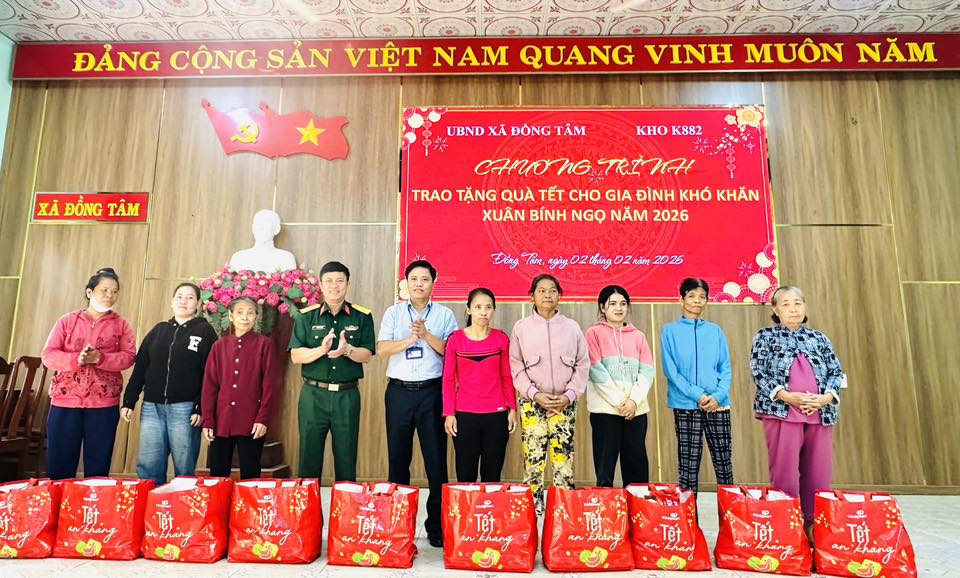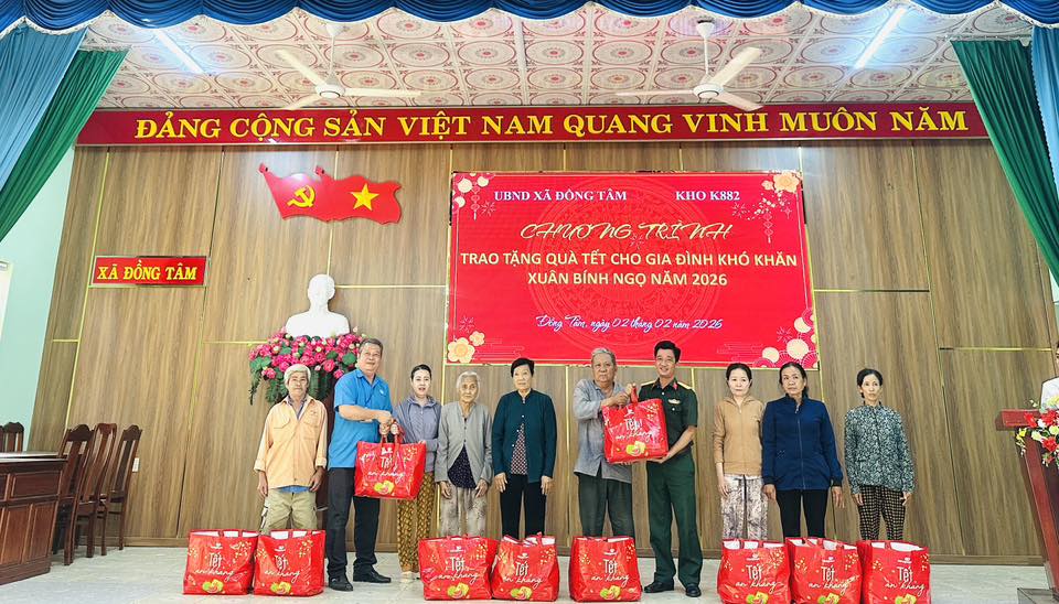 (ĐỒNG TÂM) – Nhân dịp Tết Nguyên đán Xuân Bính Ngọ năm 2026, ngày 02/02/2026, tại Hội trường UBND xã, UBND xã Đồng Tâm phối hợp với Kho K882 tổ chức chương trình tặng quà Tết cho các hộ gia đình có hoàn cảnh khó khăn trên địa bàn xã.