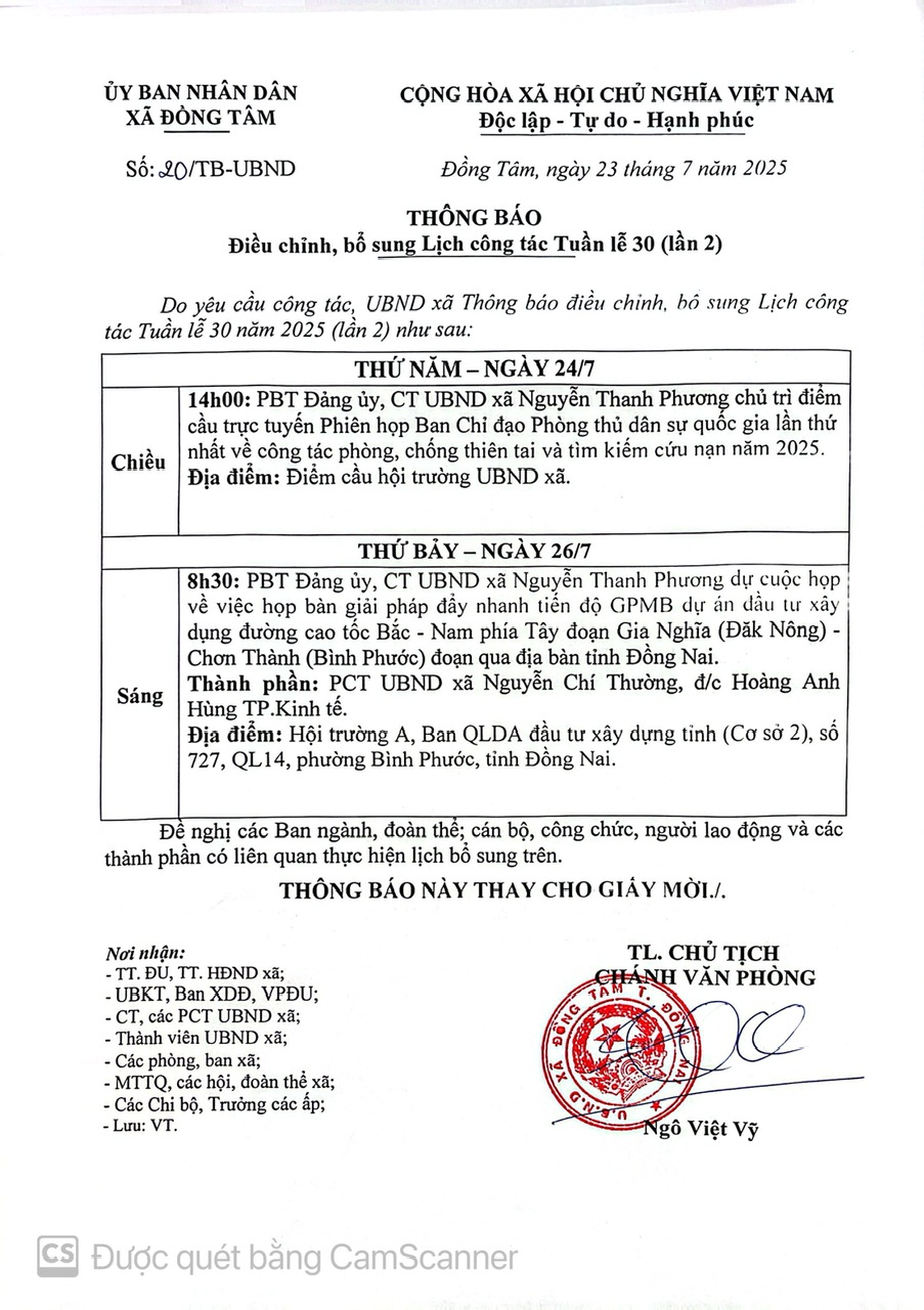 Thông báo điều chỉnh, bổ sung Lịch công tác Tuần lễ 30 năm 2025 (lần 2)