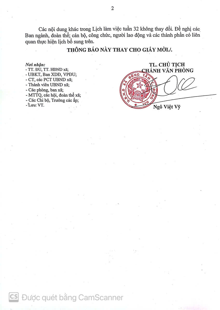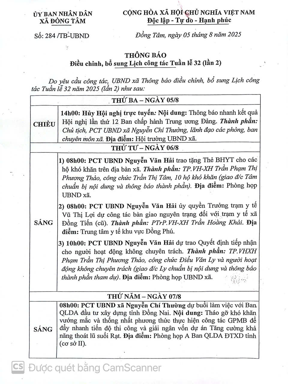 Thông báo điều chỉnh, bổ sung Lịch công tác Tuần lễ 32 năm 2025 (lần 2)