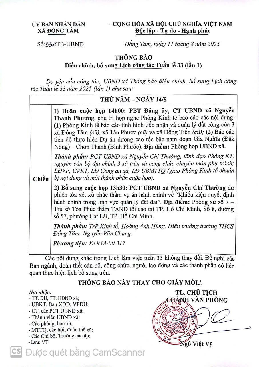 Thông báo điều chỉnh, bổ sung Lịch công tác Tuần lễ 33 năm 2025 (lần 1)