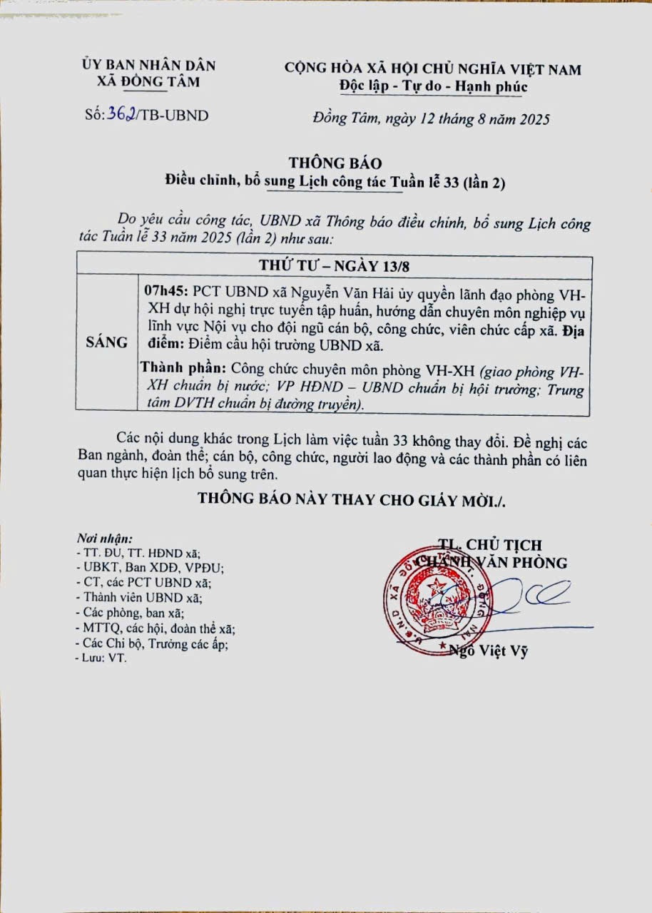 Thông báo điều chỉnh, bổ sung Lịch công tác Tuần lễ 33 năm 2025 (lần 2)
