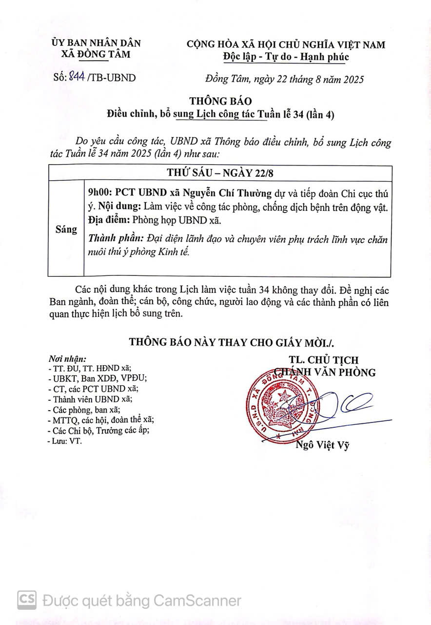 Thông báo điều chỉnh, bổ sung Lịch công tác Tuần lễ 34 năm 2025 (lần 4)