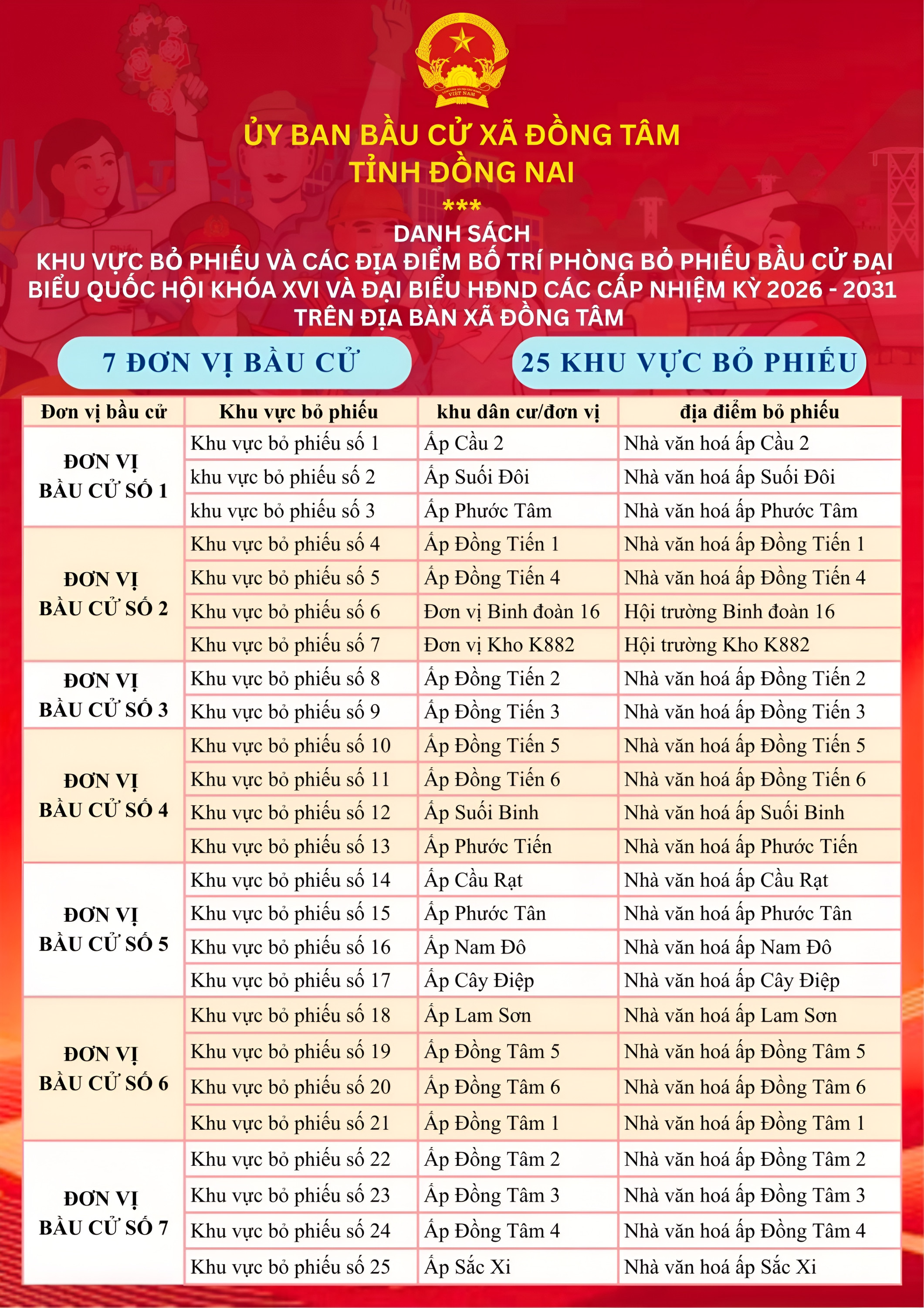 (ĐỒNG TÂM) - Danh sách các khu vực bầu cử Đại biểu Quốc hội khóa XVI và đại biểu HĐND các cấp nhiệm kỳ 2026-2031 trên địa bàn xã Đồng Tâm.